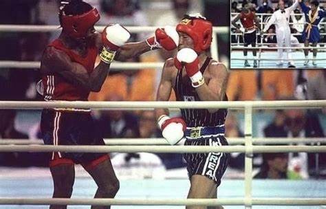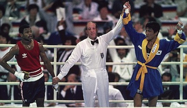 在轻重量级拳击比赛决赛上,来自美国的传奇选手小罗伊琼斯对战韩国的选手朴熙洪。
