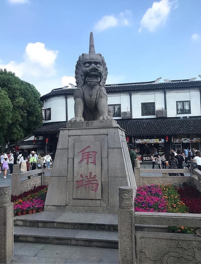 江南六大古镇中,甪直古镇是最容易读错的一个古镇名字,甪直中的“甪”应读作“lù”,它不仅是地名,更是一种汉族神话传说中的神兽名字,在甪直古镇甪端广场中央就矗立着这座神兽的雕像,是甪直古镇的标志性建筑,甪端是瑞兽,寓意吉祥如意,风调雨顺。
