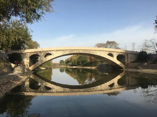 赵州桥又称“安济桥”,在河北省赵县城南2.5公里处坐落在河北省赵县洨河上,始建于隋代(公元581-618年),由著名匠师李春设计和建造,距今已有约1400年的历史,是当今世界上现存最早、保存最完善的古代敞肩石拱桥。1961年被国务院列为第一批全国重点文物保护单位。1991年,美国土木工程师学会将安济桥选定为第12个“国际历史土木工程的里程碑”,并在桥北端东侧建造了“国际历史土木工程古迹”铜牌纪念碑。