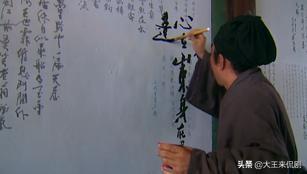 当宋江释放完情绪后,又重新坐在了桌子前喝酒,喝完一杯酒的他,抬头正好看见一堵墙,只见墙上密密麻麻写满了字,识相的小二告诉宋江,那些是过往的文人墨客留下的诗。