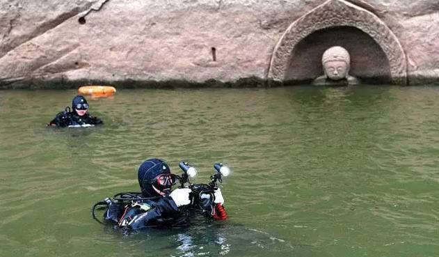 而且为了能知道在这尊佛头的底下还有什么我们不知道的东西,有专门的考古人员在进行水下考古探测工作。