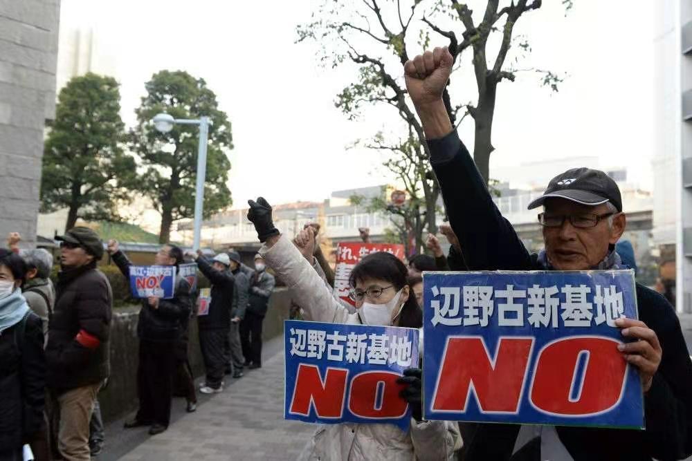 2016年12月20日,在日本首都东京,民众在日本最高法院外抗议一项涉及驻日美军基地的判决