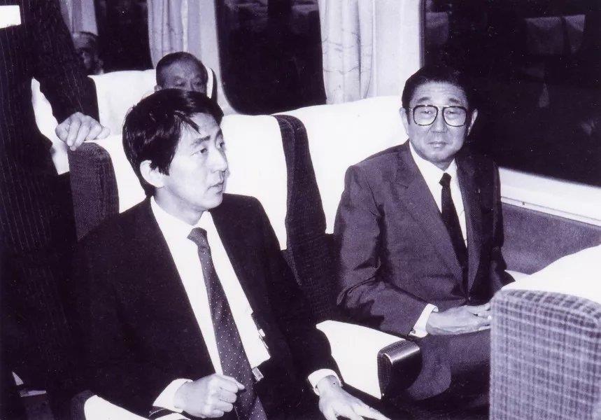 1982年11月,安倍晋三(左)与时任外务大臣的父亲安倍晋太郎(右)在一起