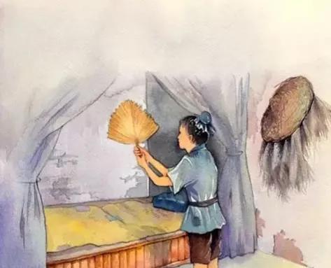 黄香汉代人,九岁母亲死了悲痛至切,后来对父亲很孝顺。夏天酷热他用扇子把父亲睡的枕头和席子给扇凉后,才让父亲就寝。