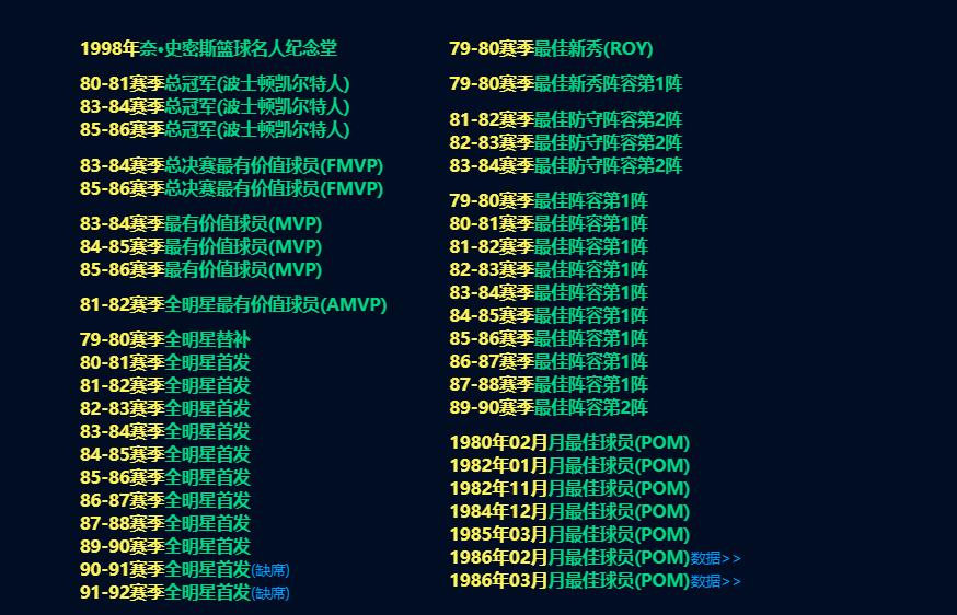 最佳新秀,3次NBA总冠军,3次常规赛MVP,2次FMVP,一次全明星赛1MVP,2次入选NBA全明星阵容,9次NBA最佳阵容一阵,3次防守二阵,1986至1988年三年包揽NBA全明星三分大赛冠军。
