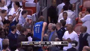 总决赛G4,达拉斯大比分1:2落后,诺维茨基自G1开始左手手指撕裂一直带着夹板,右手手腕受伤,赛前又突发流感,身体状态差到极点。
