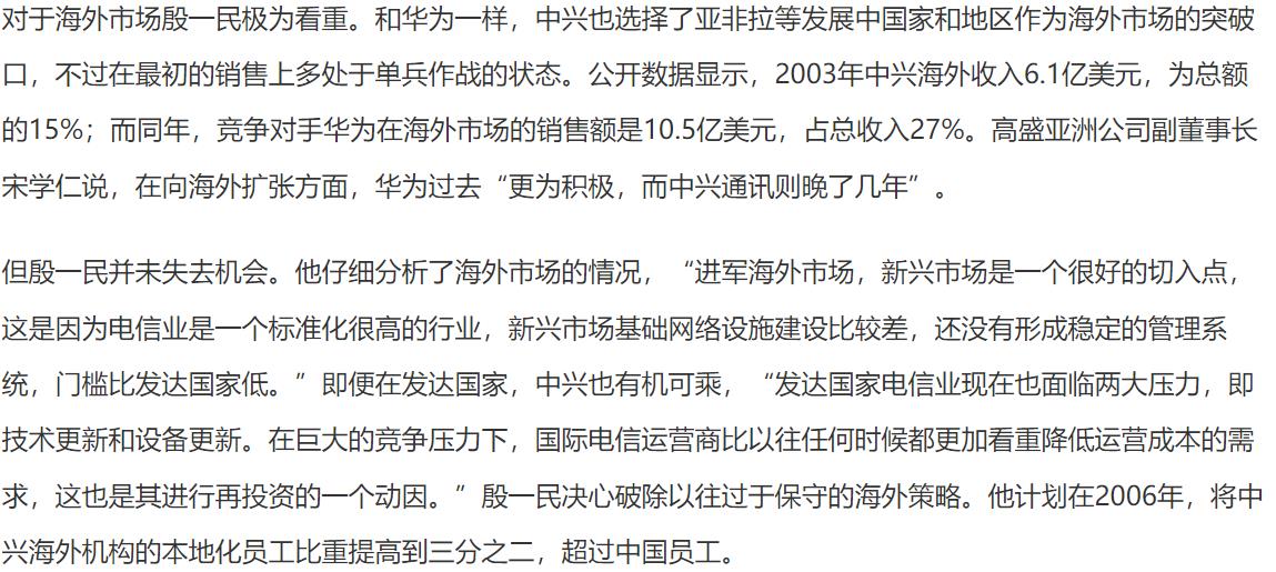 新兴市场的通信业保持高速发展,进军海外市场,新兴市场是一个很好的切入点,由于电信业是一个标准化很高的行业,新兴市场基础网络设施建设比较差,还没有形成稳定的管理系统,门槛比发达国家低。而发达国家电信业现在也面临两大压力,即技术更新和设备更新。在巨大的竞争压力下,国际电信运营商比以往任何时候都更加看重降低运营成本的需求,这也是其进行再投资的一个动因。研发和市场是电信制造企业两个最主要的部门,从事研发对于行业动态、技术发展起着关键作用,从事市场则使员工更好了解整个行业的发展,了解什么样的产品才符合用户的需求,两个环节相辅相成。
