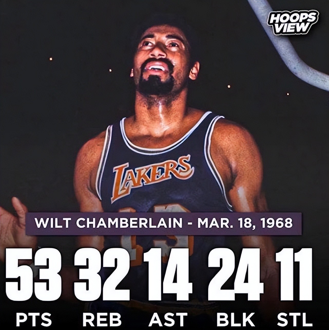 在1968年3月19日的一场76人对阵湖人的比赛中,身披紫金球衣的张伯伦犹如战神附体一般,全场狂轰53分32篮板14助攻24封盖11抢断的“超级五双”数据。然而由于NBA在1973-74赛季才正式开始将盖帽和抢断纳入技术统计,因此张伯伦这场比赛的数据无法在官方查询到。尽管如此,现场的记者和工作人员仍然将张伯伦的炸裂纪录记在了纸上,并刊登在了当时的新闻杂志上。