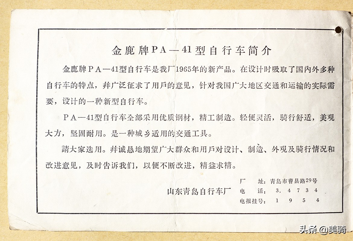 1965年,山东青岛自行车厂推出了新产品——“金鹿”牌PA-41型平车。下面这两幅图片便是这一时期说明书的封面及扉页。