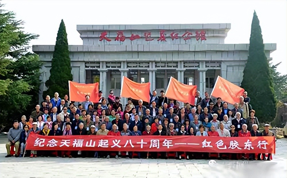 2017年 10 月 15 日~20 日,由 100 多名白发苍苍的胶东子弟兵后代,自发和自费组织的“纪念天福山起义 80 周年——红色胶东行”活动,在中共烟台市委、威海市委的热情支持下,怀着追寻父辈足迹、感恩胶东人民、实地感触红色胶东的虔诚心情,敬谒了天福山起义纪念塔、英灵山胶东烈士陵园、马石山十勇士纪念馆、栾家口八路军挺进东北纪念碑等革命纪念场馆,他们中间有当年参加过胶东“一一四暴动”的老共产党员的后代,有当年组织发动天福山起义的中共胶东特委领导人的后代,有雷神庙战斗亲历者的后代,有曾经在胶东战斗过的开国将军们的后代,有从胶东走出去的胶东子弟兵部队的后代……还有从美国赶来参加活动的第三代。他们在天福山起义纪念塔前宣誓:继承天福山起义精神,做红色基因的传承者,永远忠于中国共产党的根本宗旨,永远与中国人民站在一起。这次活动在中共十九大开幕当天(2017年10 月 18 日),由央视CCTV﹣1《新闻联播》和山东省、烟台市等媒体及时报道,引起了广泛关注。
