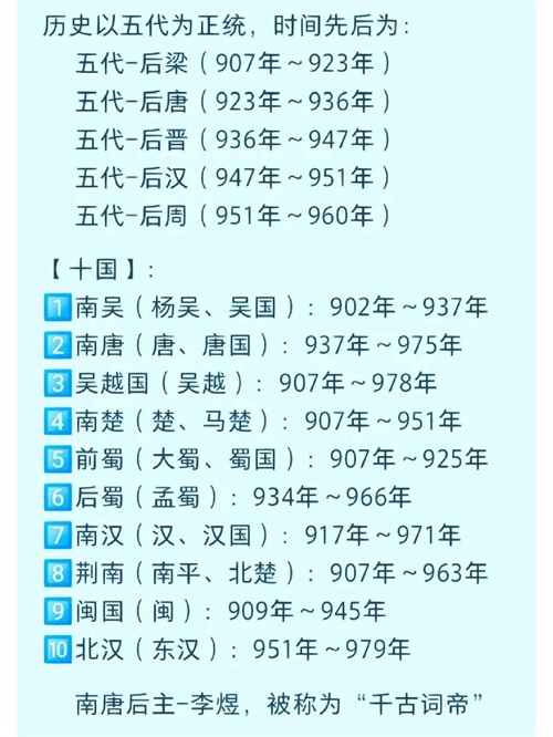 后梁(907年-923年):由朱温建立,是五代的第一个王朝。后梁虽然建立初期通过武力迅速统一了北方,但因内部腐败与外部压力,最终被后唐所取代。朱温在位期间,实行严酷的统治,导致民众怨声载道,最终在923年被后唐的李存勖所取代。