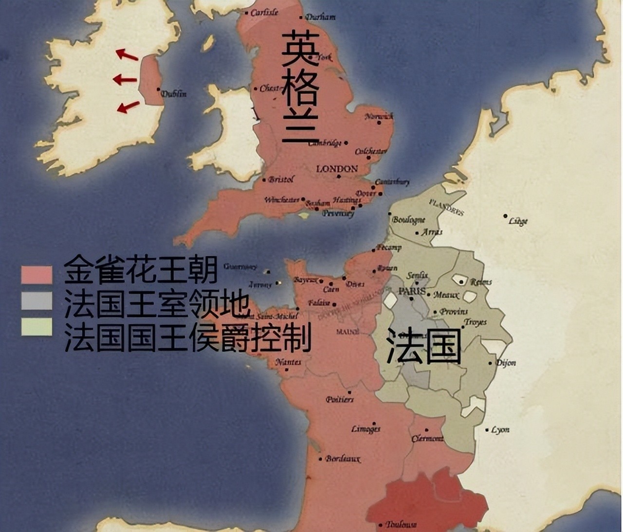 在他们眼中英格兰只是自己的领地之一,而他们的根基毕竟还是法国境内的诺曼底公国。这样就出现了一种奇葩现象:本该和法国国王平起平坐的英国国王同时又是法国治下的诺曼底公国公爵,而英国国王又利用自己兼任诺曼底公国公爵的身份和法国国王统治下的世家贵族联姻,于是法国境内的很多贵族封地实际处于英国国王控制之下。1154年威廉开创的诺曼王朝因无嗣而断绝,英格兰王位由诺曼王朝的末代之君斯蒂芬的外甥亨利继承。