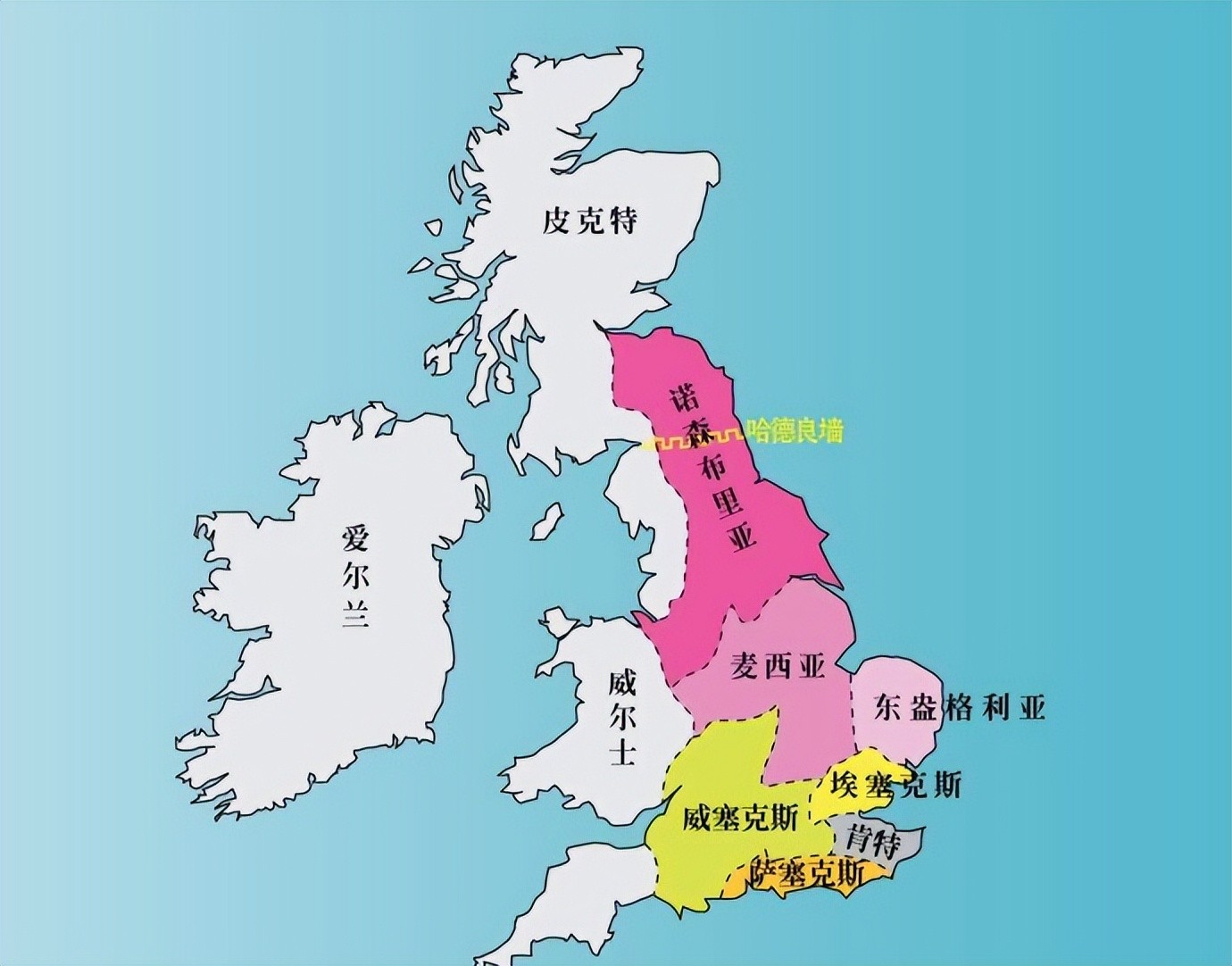盎格鲁人、撒克逊人和朱特人的后裔分别建立了肯特王国、萨塞克斯王国(南撒克逊)、韦塞克斯王国(西撒克逊)、埃塞克斯王国(东撒克逊)、诺森布里亚、东盎格利亚王国和默西亚王国。这一时期被称为英格兰七国时代。公元829年韦塞克斯国王爱格伯特统一了英格兰七国,但爱格伯特死后英格兰又重新陷入分裂状态。公元871年爱格伯特的孙子阿尔弗雷德消灭了六国复辟势力并正式给自己加上英格兰国王的头衔。