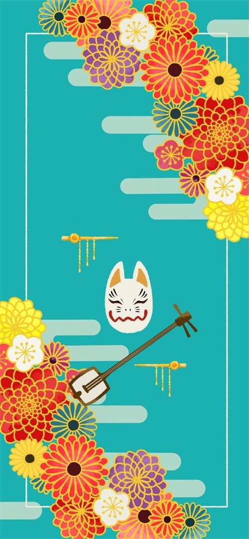 小紫壁纸的颜色就是小紫的发色,图的右上角和左下角有着盛开的花朵,这象征的是小紫和之国第一美人的身份。然后图中央的面具和琴则对应了她艺伎的身份。
