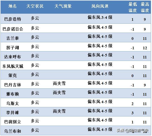 4月1日:多云,阿右旗南部、腾格里开发区、贺兰山山区有雨夹雪,偏东风4-5级,其中巴彦浩特偏东风3-4级。