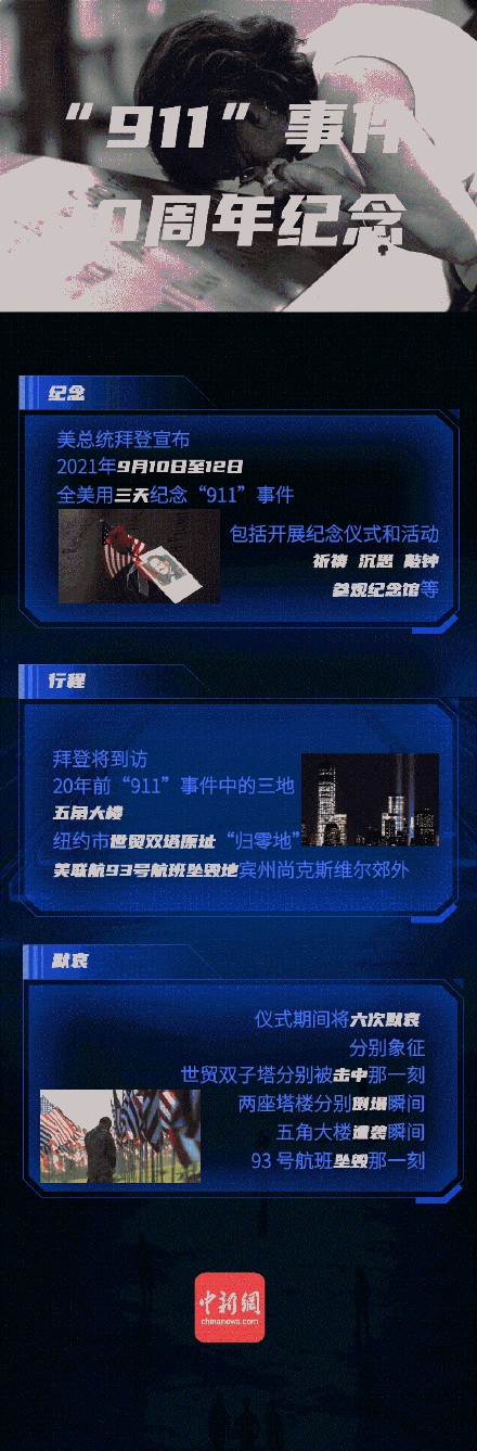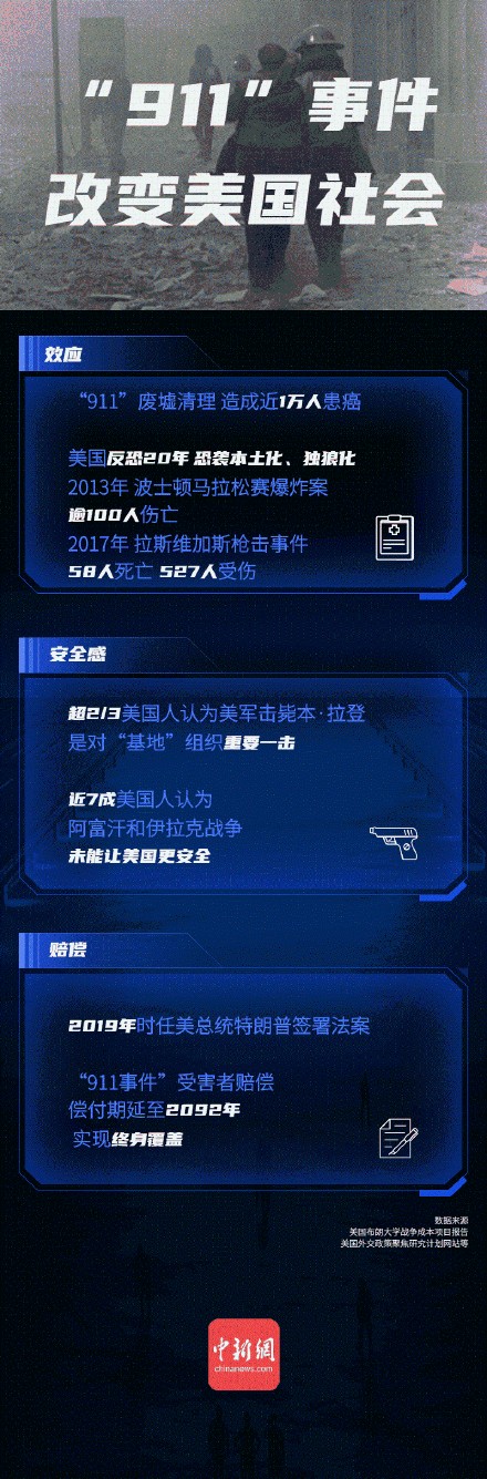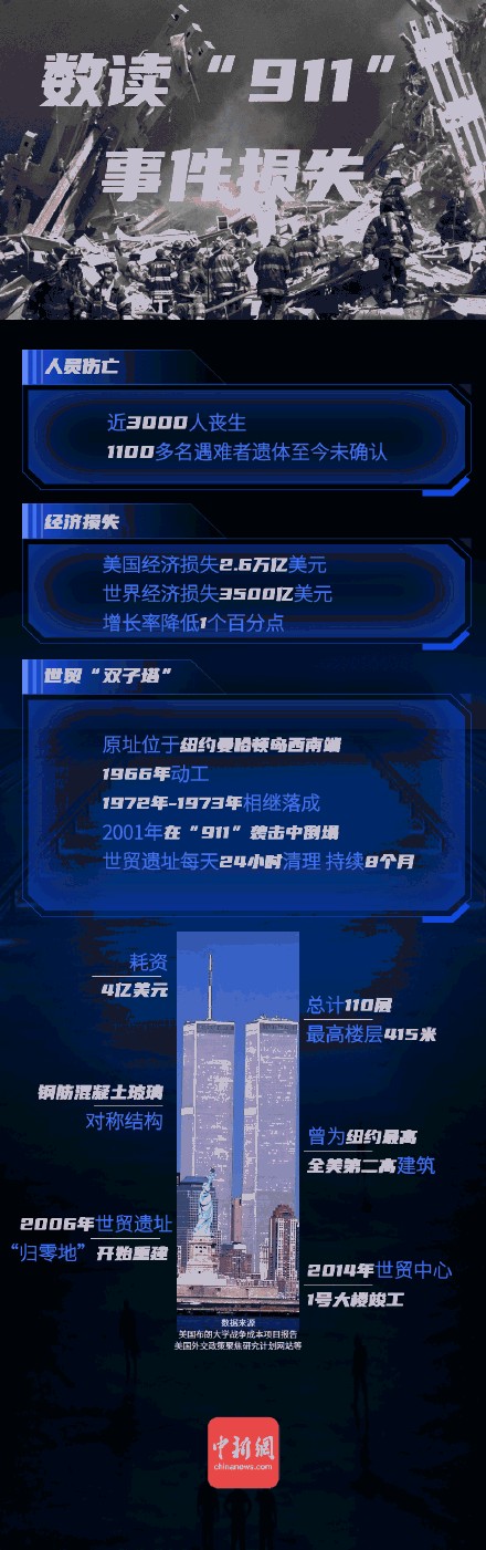 【一场浩劫:20年后,图解回顾美国911事件】2001年9月11日,美国本土发生迄今为止最严重的恐怖袭击,近3000人生命终止,曾经的美国地标化为废墟。这起恐袭的5名嫌疑人,于2003年被捕后,审判一拖再拖,至今仍未结束。美国在那之后发动的反恐战争,更是让其深陷泥潭。恐怖组织形态和恐怖袭击方式反复变化,也给各国反恐带来新的困局。小到坐飞机安检,大到国际局势变化,这场事件的时空烙印,至今仍影响着世界,也引发人们对和平与安全的思考。(文案:孟湘君 刘丹忆 张奥林 制图:孟湘君 )