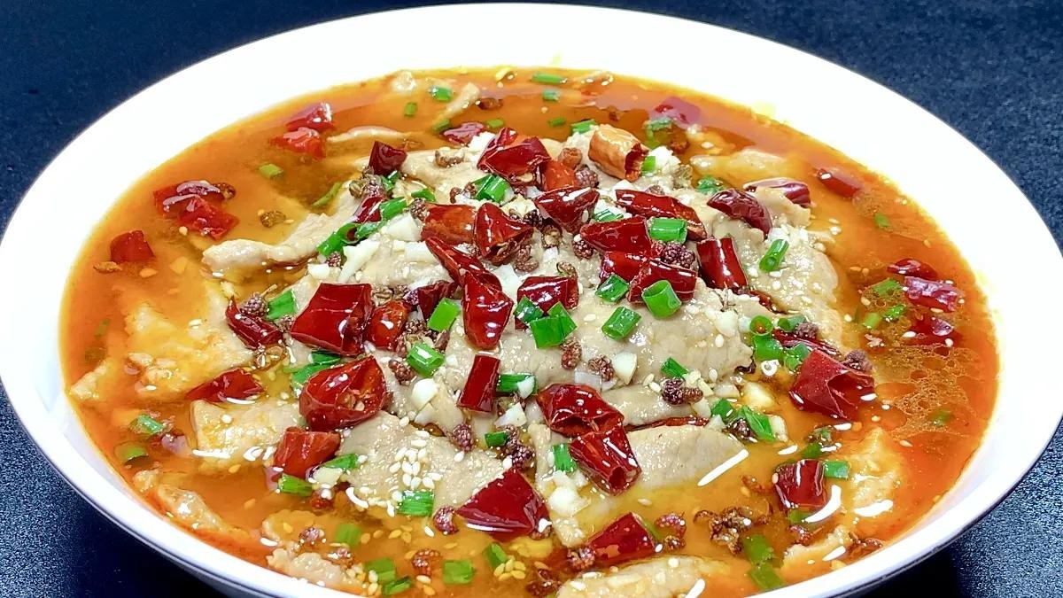 水煮肉片:满满的一大盆,肉片滑嫩,配菜丰富,又麻又辣,超级过瘾。