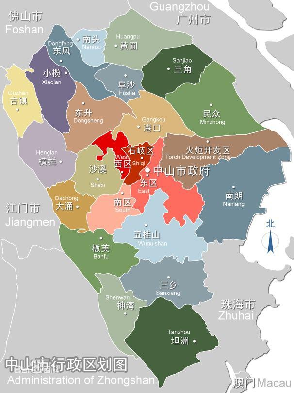 、东区、西区、南区、中山港、五桂山组成;18个镇分别是港口、三角、民众、南朗、三乡、坦洲、神湾、板芙、大涌、沙溪、横栏、古镇、小榄、东凤、南头、阜沙、黄圃、东升。
