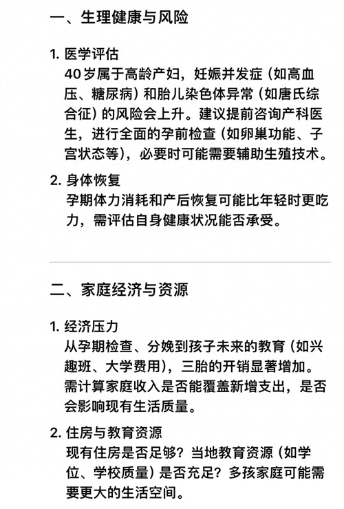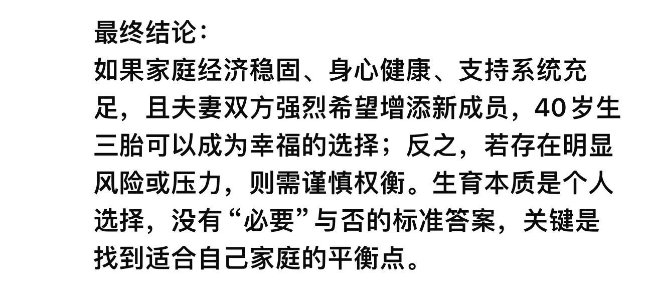 是否在40岁生三胎需要结合个人和家庭的具体情况综合考量,以下是一些关键因素供参考: