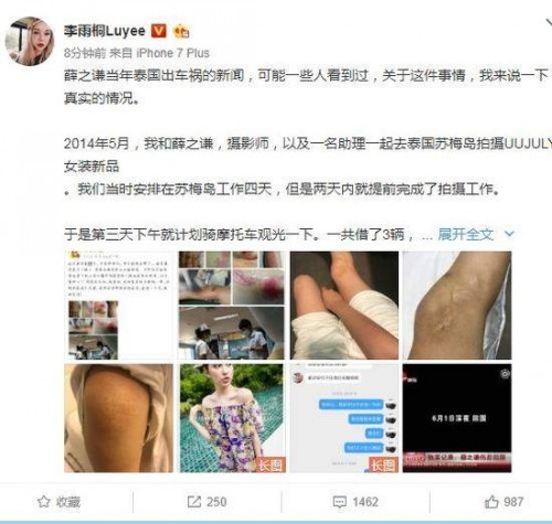 网红李雨桐继续在微博爆料薛之谦的事情,谈当年薛之谦泰国出车祸真相。透露其飙车受伤,但是却对外撒谎说是玩蹦蹦车受伤。同时,薛之谦在受伤后第一时间叫经纪人发受伤通稿,还叫来摄影师拍照。为了效果逼真,他甚至用李雨桐的受伤照发微博,谎称那是自己的受伤照。李雨桐还晒出不少照片和聊天截图,信息量大。到目前,薛之谦还没有站出来回应此事,然而细心的网友发现,薛之谦今日悄悄地将该条车祸微博删掉,但被网友抓包之后,他又将该条微博恢复。