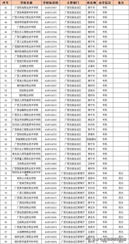 根据教育部最新发布的高校名单(截止至2024年6月20日),广西高校共计有89所,其中本科40所,专科49所。
