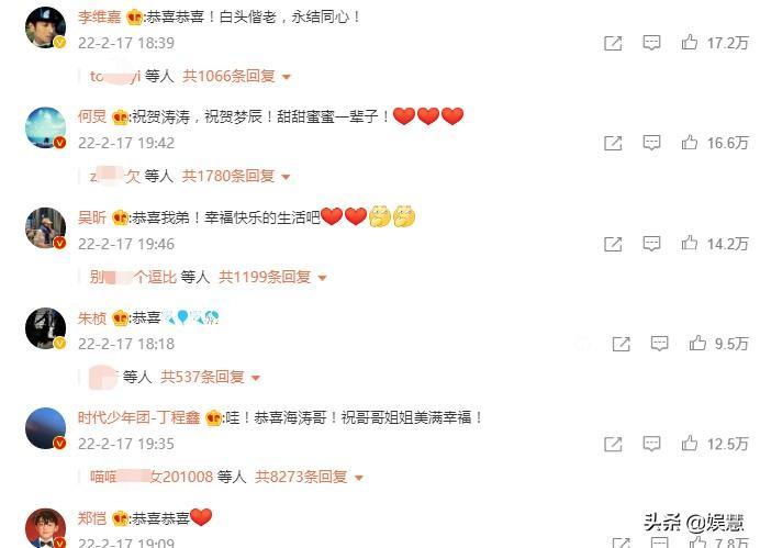 最先冒泡的是李维嘉,他很快便转发了杜海涛的微博祝福他和沈梦辰“白头偕老,永结同心。”