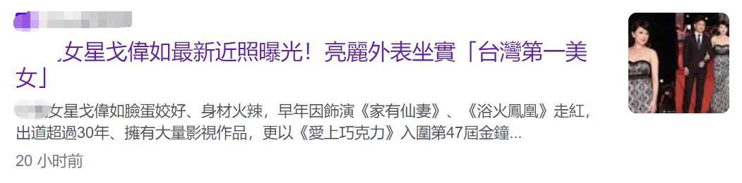 7月22日,台媒曝光了女神戈伟如的近况,息影8年的她,仍美貌出众,风采不减当年。