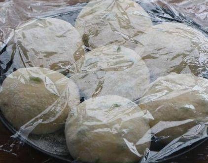 第四步:等到口捏紧后,用刀切成几个小剂子,把每个小剂子的两头向中间捏,然后合住,不留一点缝隙。紧接着把捏好的剂子揉成圆饼胚,在上面盖上一层保鲜膜,二次醒发,醒发25分钟左右即可。