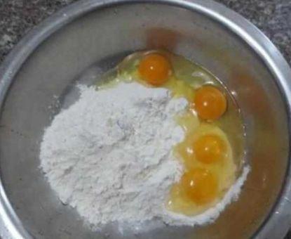 第一步:准备300克面粉,把面粉倒进盆中,再往面粉中加入3克酵母、3-4个鸡蛋,用筷子搅拌均匀,等搅拌成面絮之后,下手揉成光滑的面团,等到面团揉好后,在上面盖上保鲜膜或者湿抹布,放在比较温暖的地方进行发酵,发酵成两倍大,里面布有蜂窝状即可。