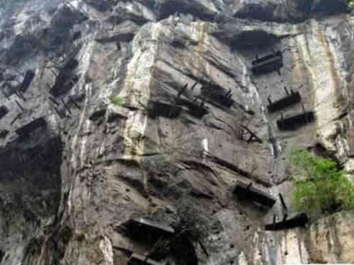 三峡悬棺,是古时候巴人的一种下葬方法。古代人逝世后,他的家里人会挑选河流沿岸地区悬崖绝壁的半腰部位,这儿离路面和山上各一百米,充分利用悬崖峭壁上的纯天然岩洞,或专门凿打洪涯洞,将棺木置放在洞内,或放置在置于管洞的木柱上。那些棺木因制成船的样子,又被置放在悬崖上,也称悬棺葬、船棺、岩棺。