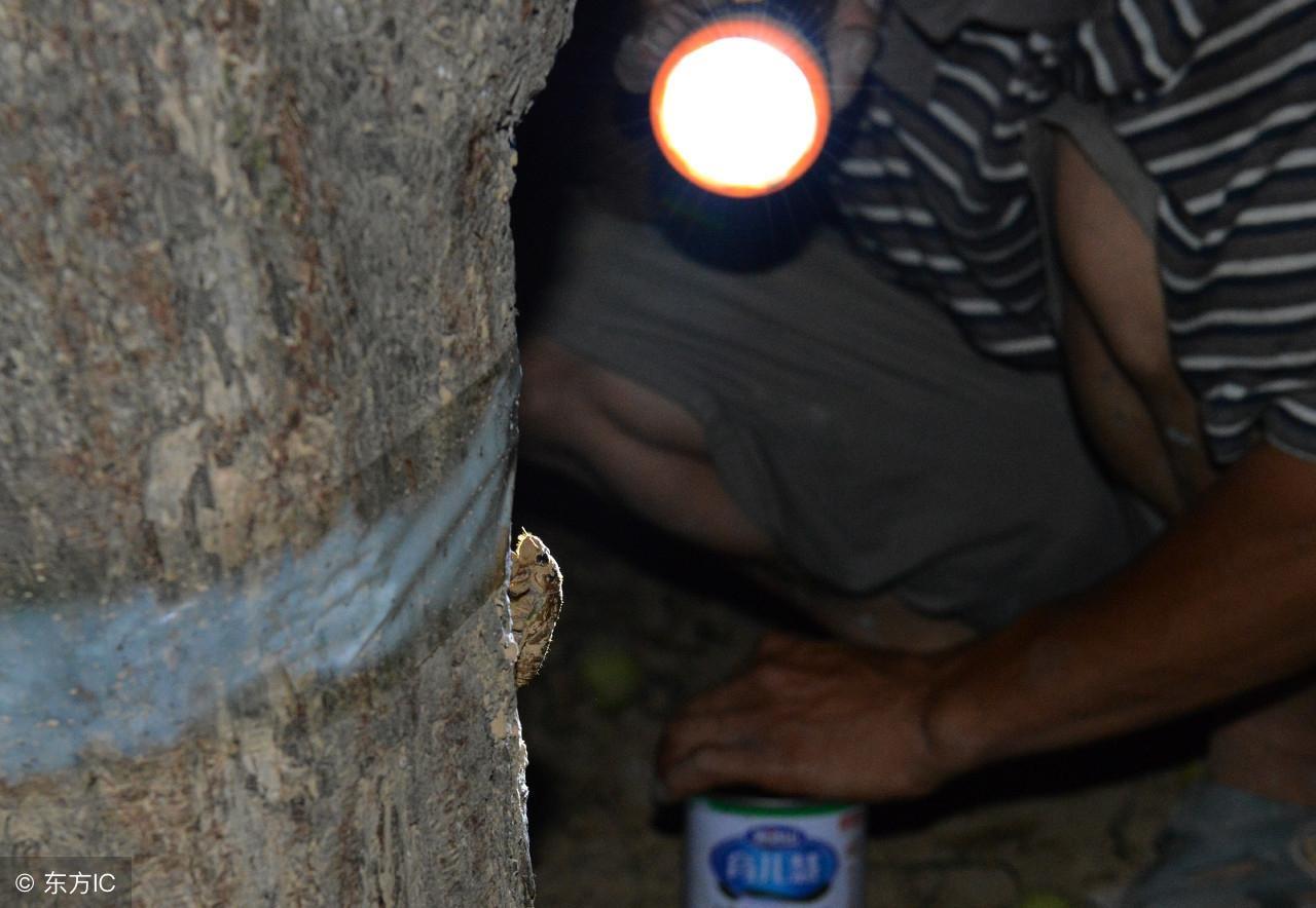 另一个方法就是用胶带缠在树干上,这也是当下金蝉农场采收金蝉商品的主要方法:在大概一米高的位置缠上塑料胶带,晚上就可以来“瓮中捉鳖”了。因为胶带很滑,贴胶带可以防止金蝉向上爬的过高,导致不好观察和捕捉。