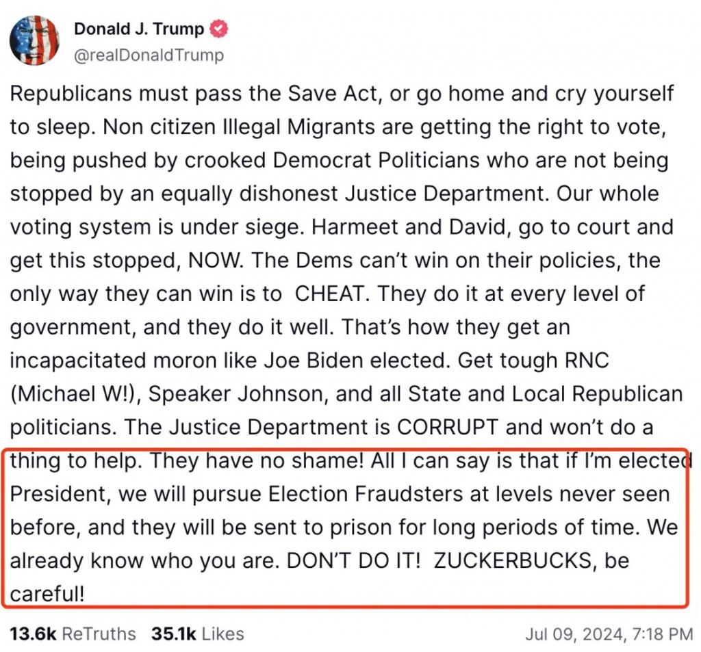 " 我们已经知道你是谁了。老实点,ZUCKERBUCKS ( 指扎克伯格利用捐款影响选举 ) ,小心点!"他补充说。特朗普是在帖子中谈到《保护美国选民资格法案》 ( Save Act ) 时发出这一威胁的。