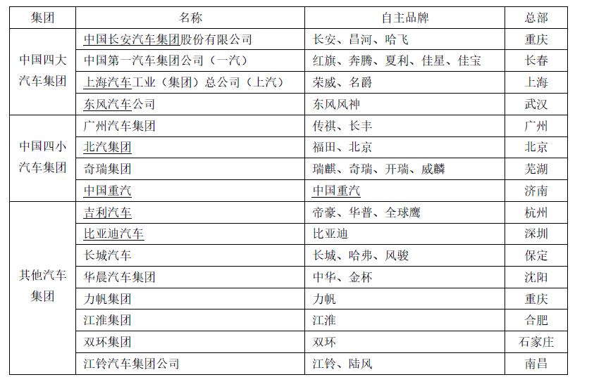 一种定义认为车型商标(厂标)为中国国内自己商标(包括引进技术产品)的为国内品牌,并视为自主品牌;挂国外厂标、商标的,为国外品牌。另一种定义认为,中国国内企业拥有完全的产品修改权、完全的品牌运营权的品牌,就可以叫做自主品牌。但不一定所有的研发工作都要在本土完成,关键是拥有自主权利。中国的自主品牌汽车种类繁杂,要想一一搞清楚,我们还是从下表各个汽车集团下的自主品牌说起。