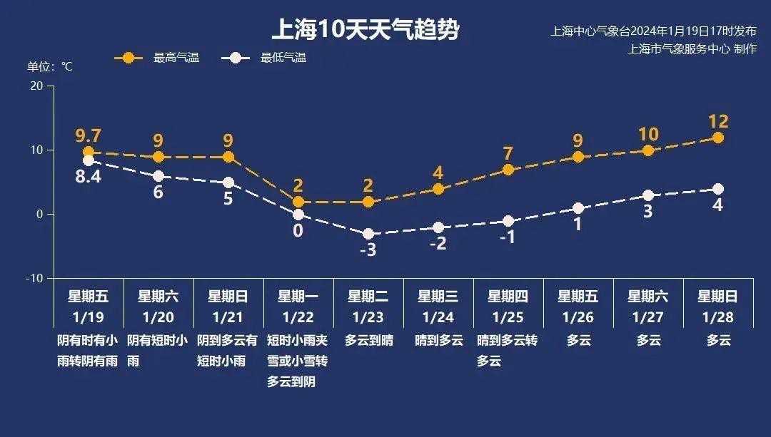 1月20日至23日,一股寒潮将自北向南影响我国中东部地区。双休日气温不高,总体在5~9℃之间。下周一气温会进一步下降,并可能出现小雪或小雨夹雪。极端最低气温将出现在下周二和周三早晨,届时气温跌破冰点。