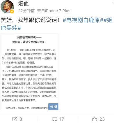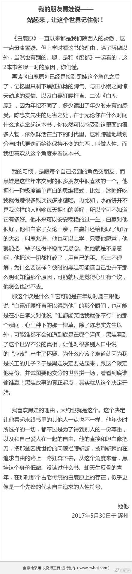 刚刚,剧版《白鹿原》黑娃的扮演者姬他在微博发表了长篇演后感,标题叫做《我的朋友黑娃说——站起来,让这个世界记住你!》。