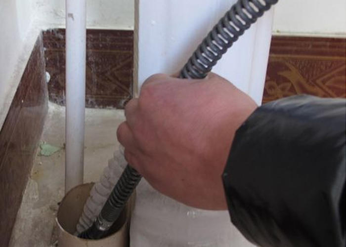 第一步完成后,我们拿起伸缩式钢丝绳,将其顺着缝隙伸进管道,然后通过手摇的方式,把钢丝慢慢钻入到下水道内,直至推不动为止。