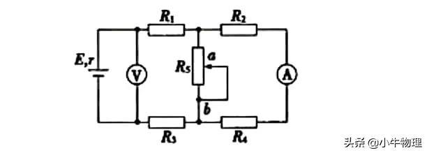 的电路中,R₁、R₂、R₃和R₄皆为定值电阻,R₅为可变电阻,电源的电动势为E,内阻为r,设电流表A的读数为I,电压表V的读数为U,当R₅的滑动触点向图中a端移动时()
