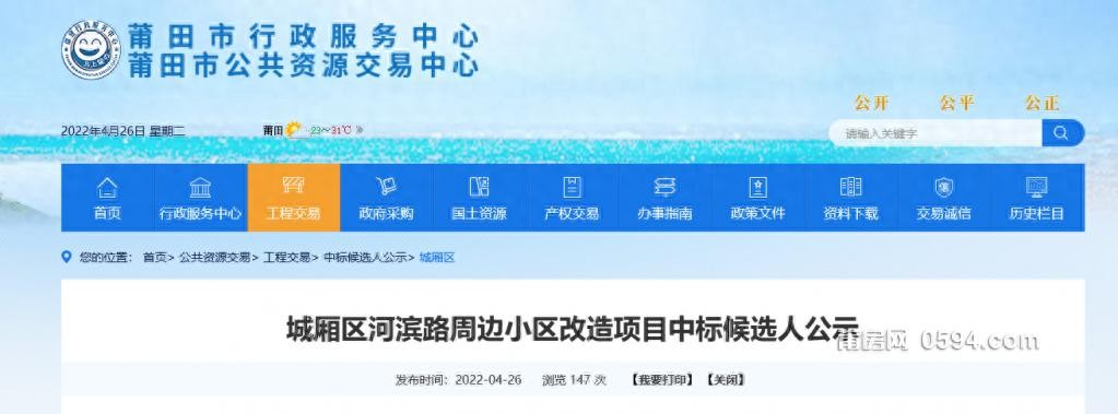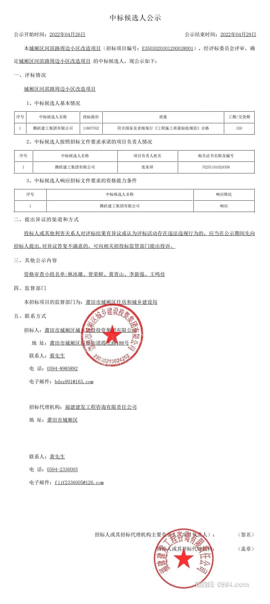 最新消息:莆田市公共资源交易中心发布城厢区河滨路周边小区改造项目中标候选人公示,腾跃建工集团有限公司中标。该项目改造范围约84000平方米,建设内容包括道路改造工程、管道工程、景观绿化工程、小区其他配套设施工程、通讯工程等,项目工期为330个日历天,投标价格为11807762元,具体内容如下: