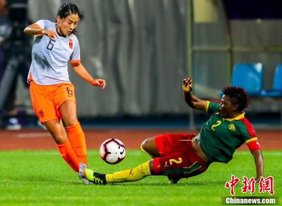 4月7日,中国队5号吴海燕比赛中稳健防守。在刚刚结束的女足四国赛决赛中,中国队以1:0战胜喀麦隆队夺得冠军。(中新社记者 张畅 摄)