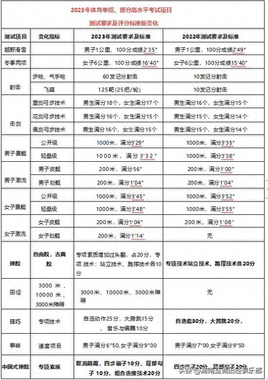 对比了2022年和2023年《普通高等学校运动训练、武术与民族传统体育专业体育专项考试方法与评分标准》,2023年体育单招、部分高水平考试项目测试要求及评分标准有了新变化,冬季项目、夏季项目的个别项目均有调整。