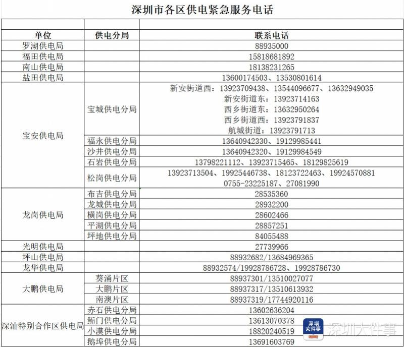 深圳已临时开通各区供电抢修紧急服务电话