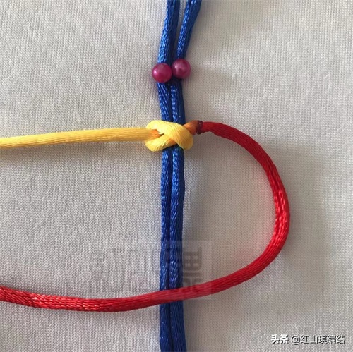 黄绳按图压红绳从蓝色短绳后面穿环