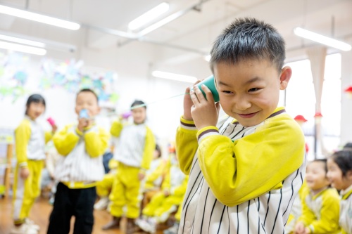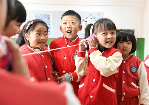 3月3日,浙江省湖州市长兴县龙山幼儿园,孩子们利用自制的传声筒听取声音。新华社发(谭云俸摄)