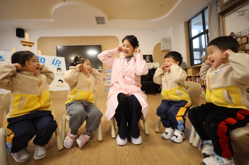 3月3日,在河南省开封市河南大学幼儿园金明园区教室里,保健老师与孩子互动做护耳游戏。新华社发(石斐摄)