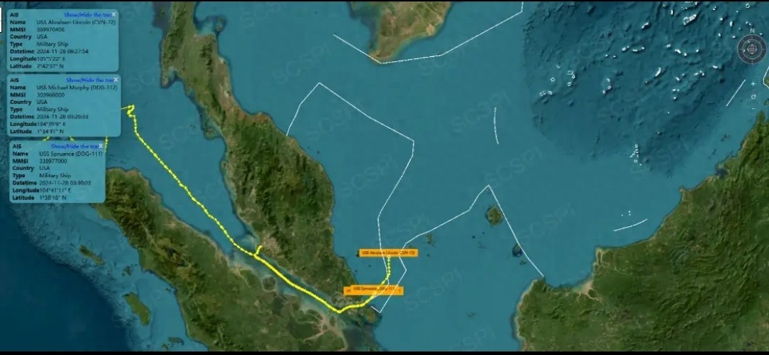 11月28日,美军“林肯号”航母于凌晨5点多通过马六甲进入我国南海!