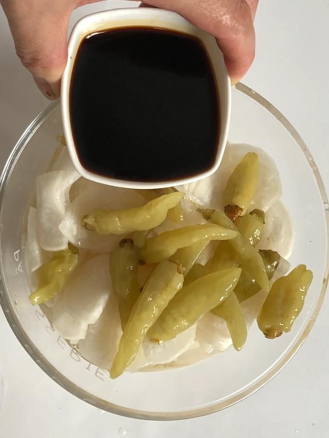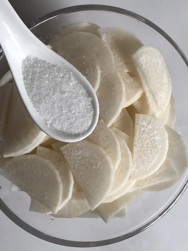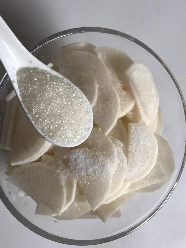 1️⃣白萝卜切片➕1勺盐➕1勺糖腌制出水,并攥出多余的水分。
