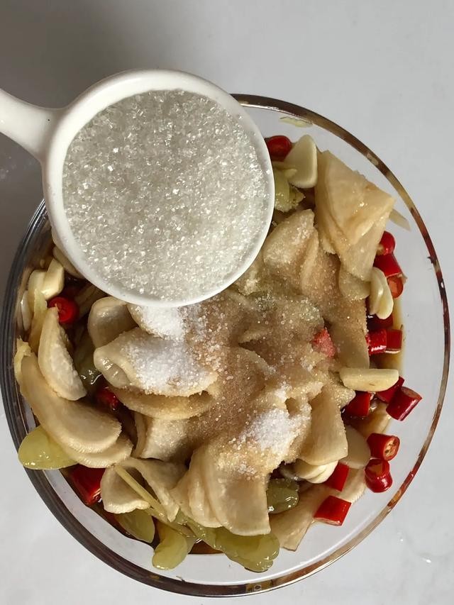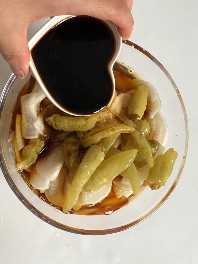 2️⃣半碗泡椒➕小半碗醋➕小半碗味极鲜酱油➕姜蒜小米椒➕1大勺盐➕1大勺糖,密封腌制12小时以上。