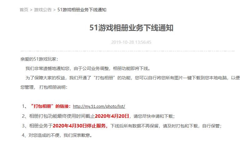 公告显示相册业务于2020年4月30日停止服务,为了避免80、90后的青春回忆丢失,51游戏为老用户提供相册打包功能,最终使用时间截止2020年4月20日。