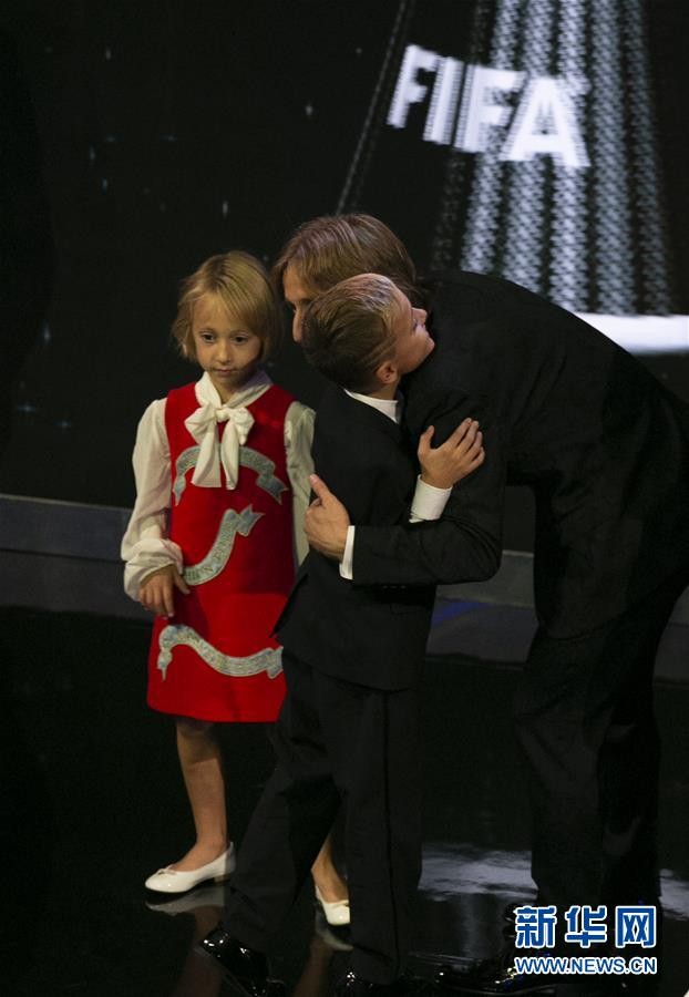 9月24日,克罗地亚球员莫德里奇(右)在颁奖典礼后与儿女拥抱。 新华社记者韩岩摄