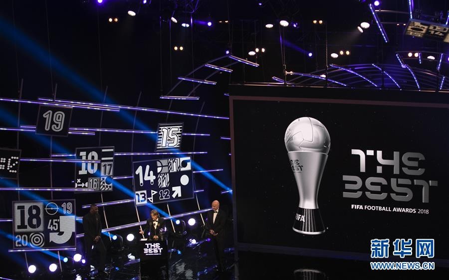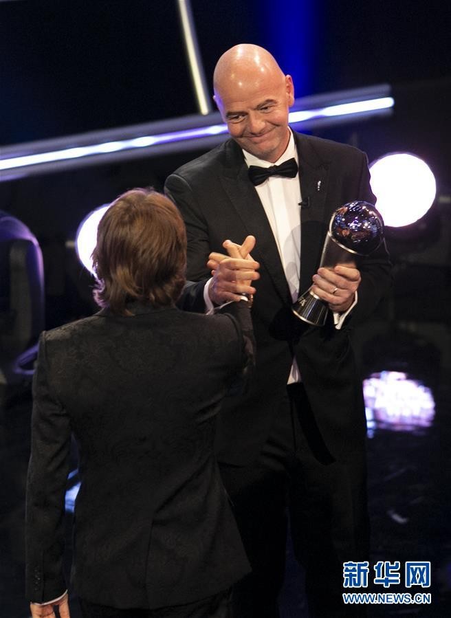 9月24日,国际足联主席因凡蒂诺(右)与克罗地亚球员莫德里奇在颁奖典礼上。 当日,2018国际足联年度颁奖典礼在伦敦举行,克罗地亚球员莫德里奇当选本年度“世界足球先生”。 新华社记者韩岩摄